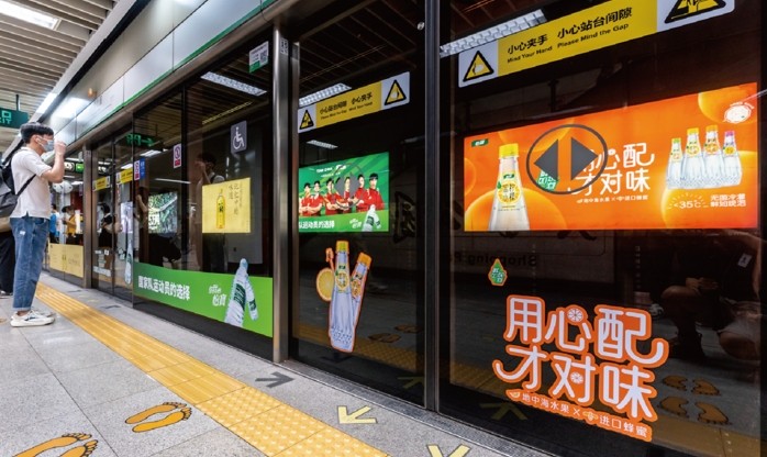 主要分布在不同線路站廳換乘的通道內(nèi),覆蓋雙線客流密集的換乘區(qū)域,墻貼+燈箱的媒體組合拳加速品牌代入感,形成獨(dú)立的超級(jí)品牌空間,