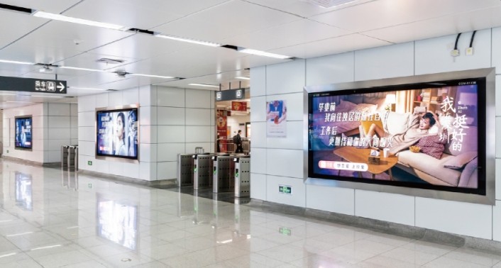 主要分布在各A+級(jí)及以上站點(diǎn)站廳的主體墻面上,屏幕變換刷屏,多組畫(huà)面輪播,吸睛程度up,畫(huà)面展示 效果更精致,適用于品牌形象宣傳。