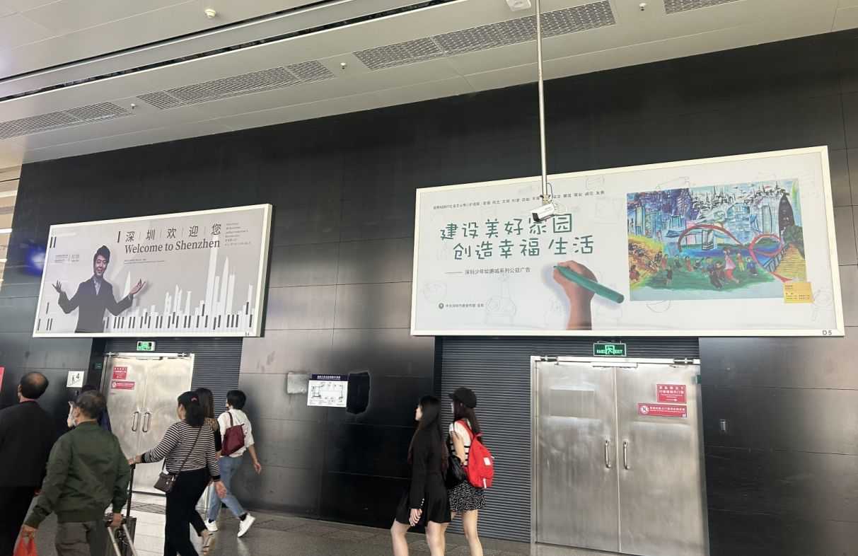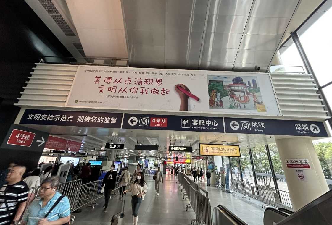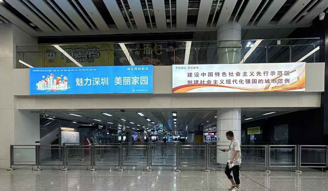 覆蓋深圳前往香港、國外的出境旅客,跨境學童等候區。私家車、出租車落客區,去衛生間必經,與旅客距離近,有視覺沖擊。