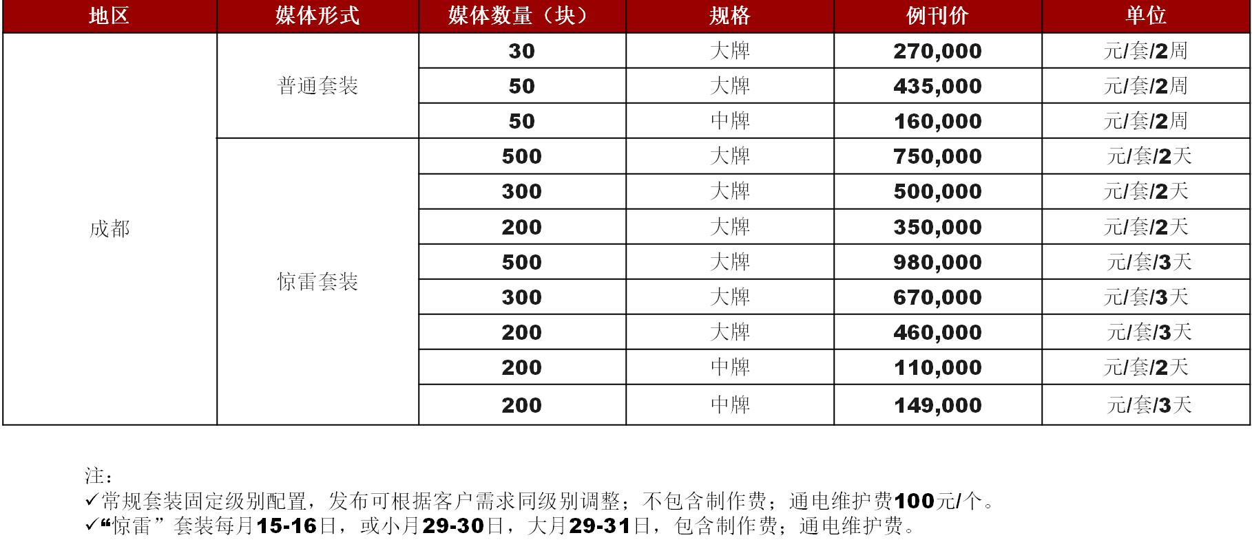 | 成都主城區 2018年度新一線城市 覆蓋成都中心城區80%以上點位 1200塊燈箱 人民南路、蜀都大道、順城大道、長順街、二環路、 益州大道、青羊大道、東大街、蓉都大道……春熙路、天府廣場、鹽市口、總府路…… 成都-金堂縣 成都東進戰略主戰場 230塊燈箱 迎賓大道、十里大道、成金大道、濱江路、萬達商圈、大學城…… ? |