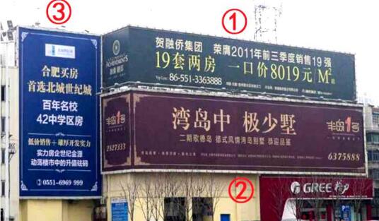 | 合肥落地看板廣告 媒體位置:北一環(huán)與亳州路及長(zhǎng)豐路5岔路口 發(fā)布形式:噴繪畫面 媒體規(guī)格:18.8m×8.5m =160㎡/塊 媒體簡(jiǎn)介:廣告牌位于合肥北一環(huán)最重要的路口,也是合肥唯一的5岔路口,此處每天的人車流量極大,等候紅燈時(shí)間長(zhǎng)達(dá)3分鐘以上。牌面東側(cè)即為:廬陽(yáng)區(qū)政府,財(cái)富廣場(chǎng),柏景灣等;對(duì)面即為:祥源廣場(chǎng),香格里拉大飯店,廬陽(yáng)中學(xué),壽春中學(xué)等;廣告位南側(cè)為:華潤(rùn)歡樂(lè)頌購(gòu)物中心,省武警醫(yī)院,元一美邦國(guó)際等。此處實(shí)為不可多得的戶外廣告投放陣地 |
