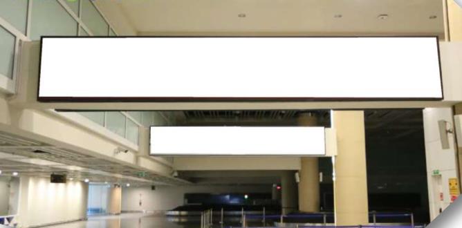 放置在右側的到達行李認領處天花板上。供在傳送帶周圍漫游以領取行李的乘客觀看