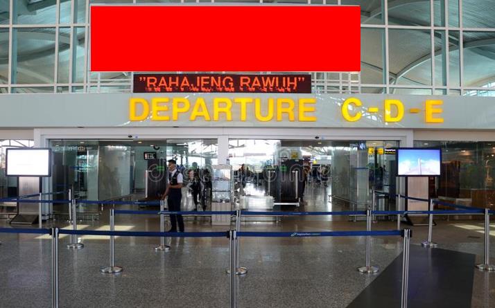 Placed on top of International Departure Entrance C-D-E, Facing incoming passengers from drop off point heading to Departure check-in area, this open public sites also can be seen by other airport visitors that roaming around this area for shopping or take a coffee /meal here.