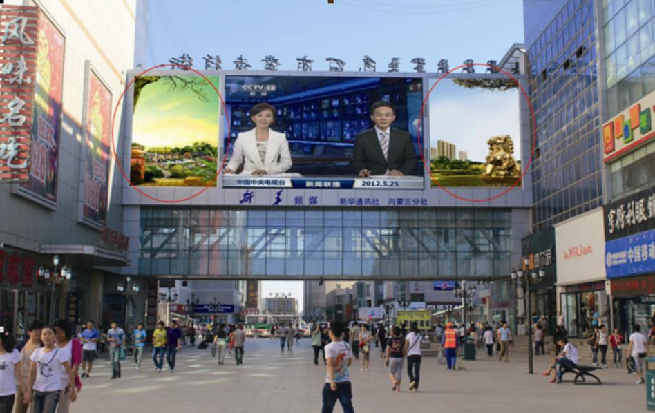廣告描述:此廣告屏幕位于包百步行街南端人流了密集、附近包百商圈中心位置,屏幕下方為包頭最大夜市集中地。