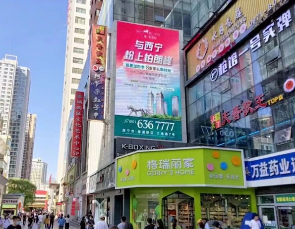 該屏位于西寧市花園北街口,湟光十字東北角恒潤大廈,其色彩飽滿,動(dòng)態(tài)畫面或多幀切換效果,戶外超清P6顯示屏,畫面展示內(nèi)容更加豐滿,廣告訴求表達(dá)更為完善,強(qiáng)化廣告內(nèi)容可看性。