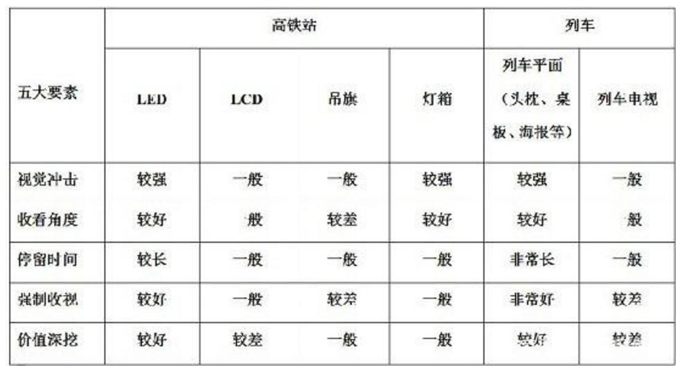 高鐵廣告媒體傳播的節點特性明顯,為社會化價值觀傳播提供了契機。回家、探親、學流、旅游等出行節點為企業在階段行品牌傳播上創造了社會化價值傳播內容。高鐵站內媒介優劣勢分析高鐵LCD媒體:媒體位置較散,畫面小,品質低,關注度較低;高鐵吊旗媒體:媒體位置過高,超出正常的視覺范圍,光線暗,導致到達率較低;列車電視媒體:媒體點位少,覆蓋范圍有限;廣告時段一小時一次,品牌曝光率低;列車雜志媒體:受旅客自主取閱影響,5個座位一份,廣告到達率低;翻閱時存在廣告抵觸心理,會直接翻過,接觸率低;漏放丟失嚴重,監測困難;高鐵LED媒體:與車次信息結合,強制觀看,廣告到達率高;站內唯一權威發布平臺,具備公信力;媒體位置較好,畫面大,視覺震撼強,關注度高。列車平面媒體:媒體資源豐富,可根據車型、線路劃分各級消費人群;位置醒目,可視效果好,沖擊力強;面對面,一對一近距離吸引,到達率高;高鐵燈箱廣告:媒體位置較多,形成點攔截;部分媒體位置醒目,干擾媒體少,到達率高;