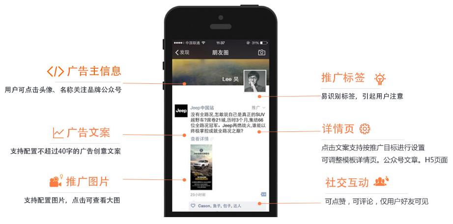 朋友圈廣告展示的位置是首次打開(kāi)朋友圈的時(shí)候,在朋友圈的第五條位置,它的樣式類似于朋友發(fā)的原創(chuàng)內(nèi)容,如果不注意右上角的“廣告”字樣,很難判斷出他是朋友圈的廣告,這種廣告以不打擾朋友的形式展示出來(lái),讓網(wǎng)民不反感,更容易接受,也被很多商家認(rèn)可。