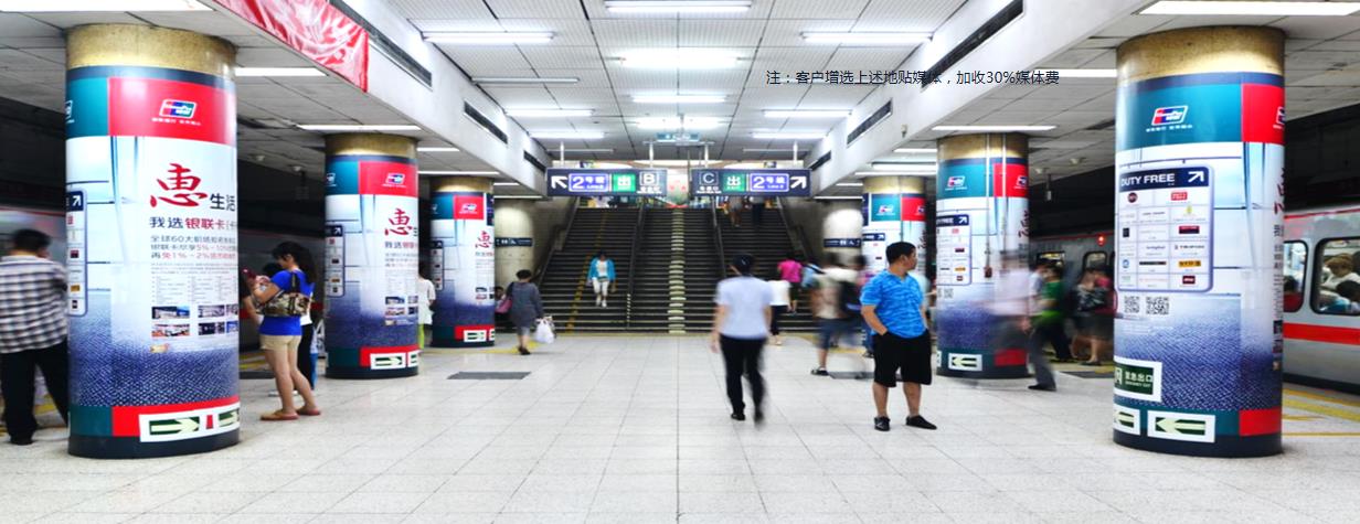 媒體優勢與運用: 復興門站是北京地鐵1號線與2號線的換乘站,客流量極大,臨近中國金融業最具影響力的金融中心區--金融街。站臺包柱不僅覆蓋本站乘客,大部分途經復興門的乘客都可以形成一定印象,適合提升品牌形象。