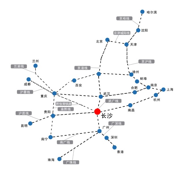 武廣高鐵,滬昆高鐵,建設(shè)中的渝長廈高鐵,讓長沙成為世界上唯一有多條高鐵交匯的城市。武廣、滬昆兩條高鐵大動脈在此交匯,使得長沙成為中部最大的全國性高鐵樞紐城市,也被稱作為“離世界最近的地方”。