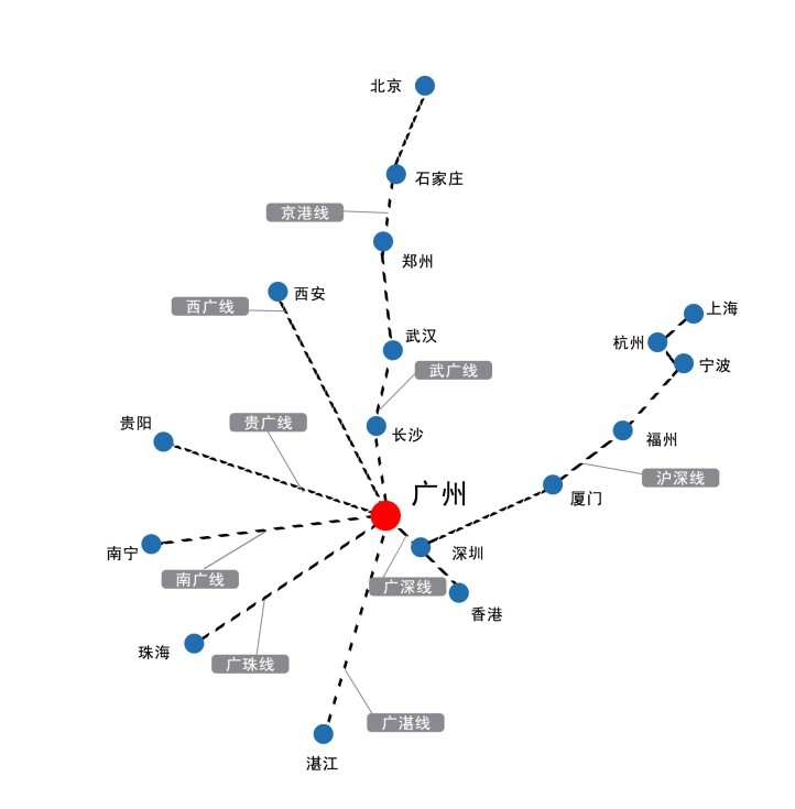 廣州南站是國家“八橫八縱”的京哈-京港澳、蘭廣、廣昆三大干線通道的交會點并連接深茂鐵路與廣汕高鐵,是粵港澳大灣區(qū)、泛珠江三角洲地區(qū)的鐵路核心車站,是廣州連接香港、深圳兩個國際城市的頂級樞紐。