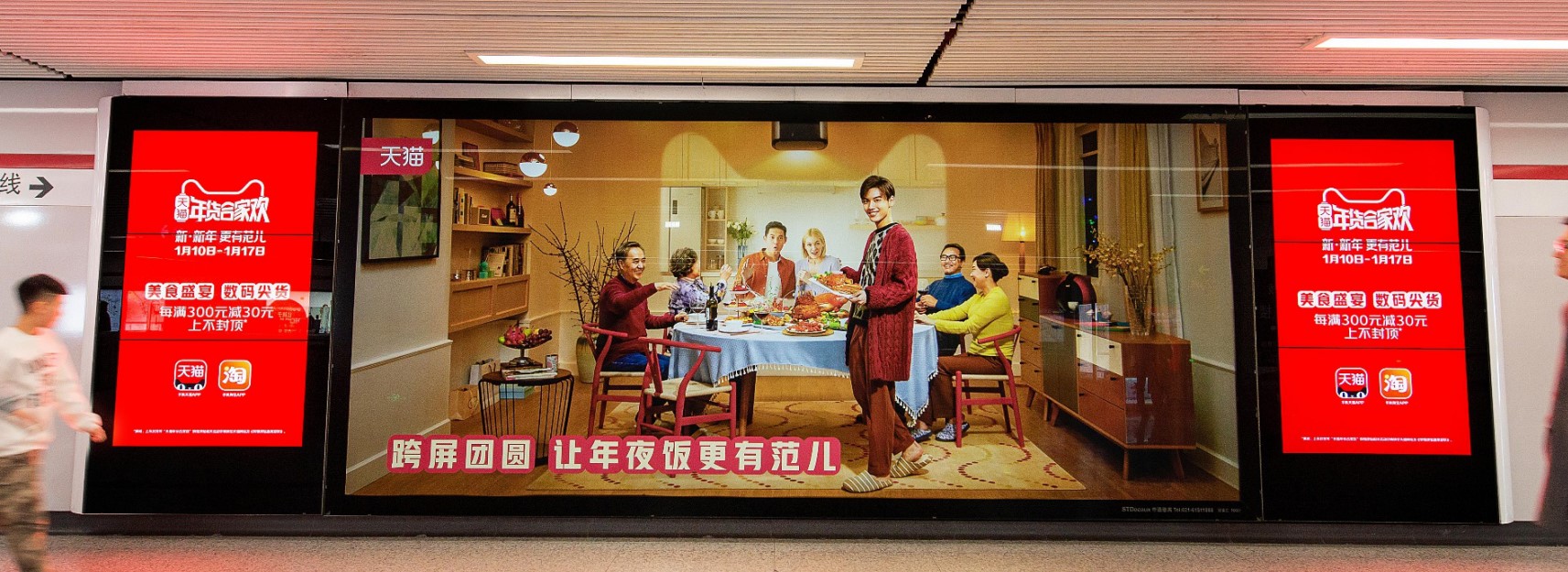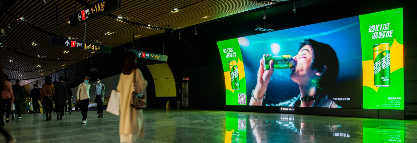 由 電子屏 與 超級動感燈箱,相互交錯組成的電子媒體通道,大面積的靜態海報與高精度的動態畫面不斷沖擊乘客視覺;頂部天花板與通道內柱體的鏡面環境設計從空間上帶來沉浸式的3D體驗;每個區域的定向音響環繞聲系統 從聽覺上刺激乘客的感官體驗 ,日均客流達55萬*人次 支持動畫、TVC、電子海報等,可制作各種大型創意效果