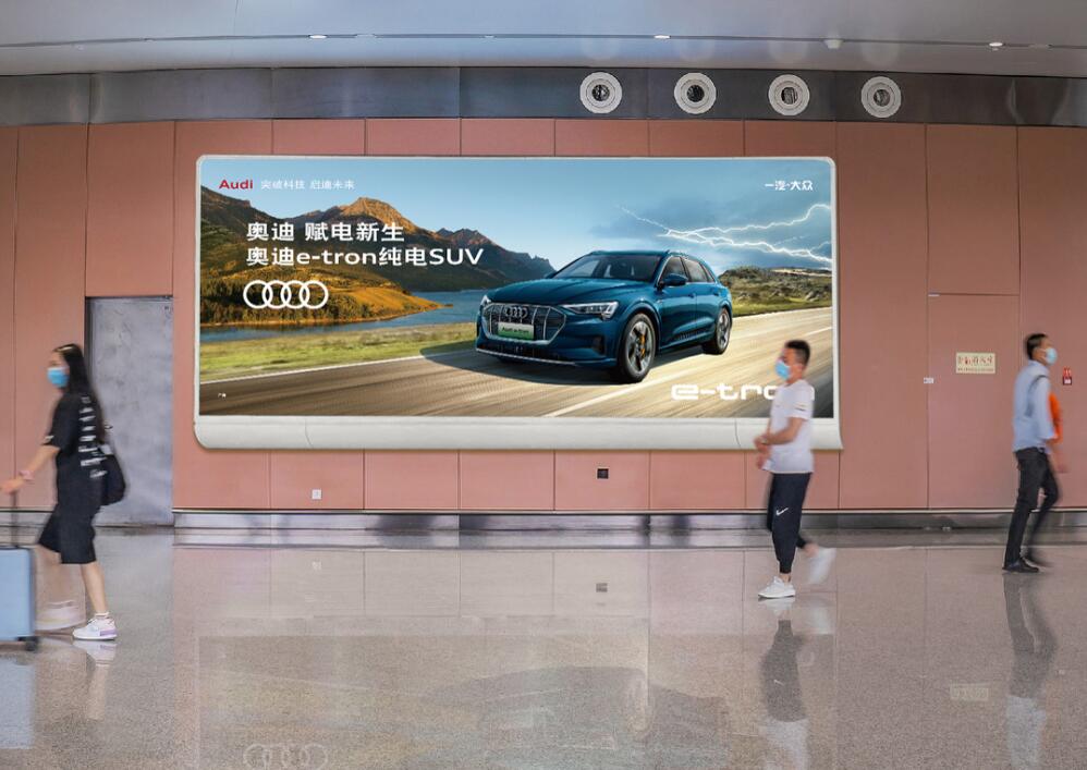 媒體分析: 軌道交通必經區 100%覆蓋乘坐地鐵和高鐵往來機場的人群。面向地下一層值機區,雙面呈現聯排布局,在人群前往值機、值機后前往安檢的路徑上形成必經必視、多次曝光的傳播效果。