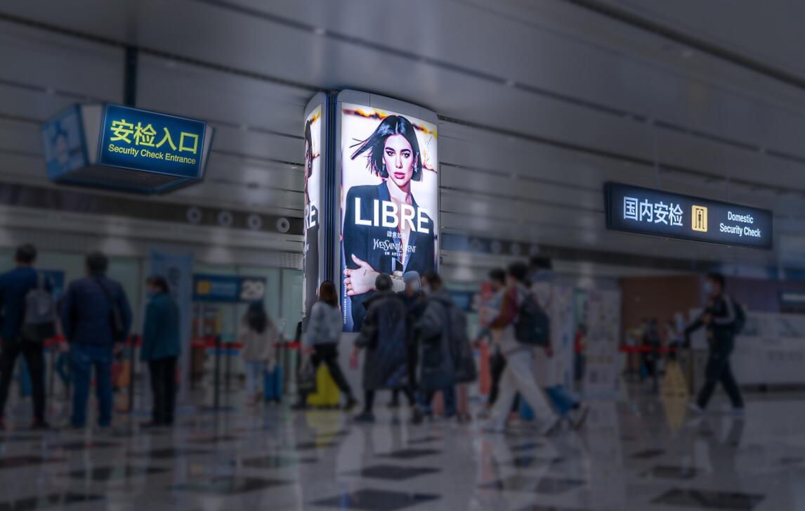 媒體分析: 中央樞紐區 位于三層國內值機大廳中央樞紐區域,四面品牌柱對稱式發布,100%覆蓋三層以及四層值機的國內出發旅客。
