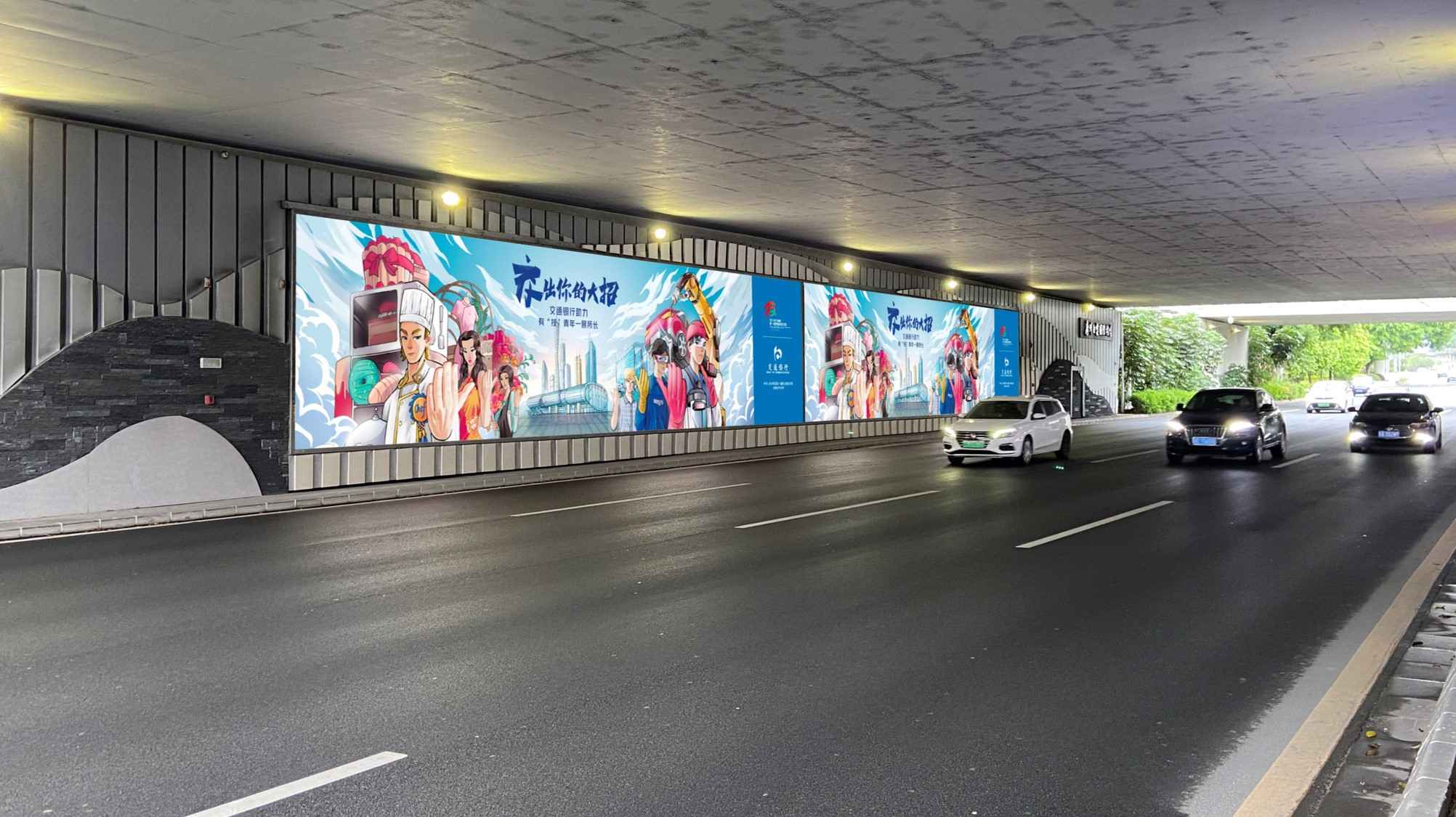 ①機場航站樓前,飛機滑行橋下兩側橋身墻體 。