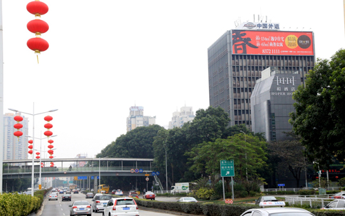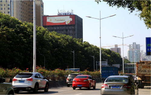 該廣告牌位于濱河路與皇崗路交匯處外運大廈東面墻體,濱河路是深圳車流密度最大的主干道之一,而皇崗路是連接市中心的交通要道,因此廣告牌垂直于路面,大氣美觀,處于十分顯眼的位置,可視距離非常遠,視覺效果十分突出,該廣告牌能覆蓋了羅湖,福田,南山往來的車輛及人群,受眾廣泛且層次高。