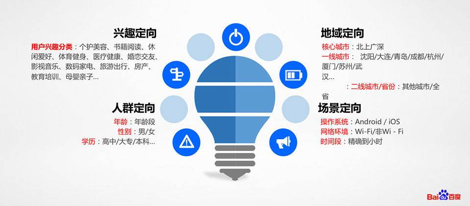 百度大數據根據用戶興趣定向、人群定向,地域定向,場景定向,基本屬性精確鎖定高潛力用戶。