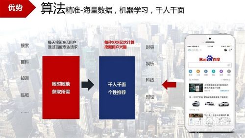 全球最大的中文搜索引擎 作為全球最大的中文搜索引擎公司,百度一直致力于讓網民更平等的獲取信息,找到所求。百度是用戶獲取信息的最主要入口,隨著移動互聯網的發展,百度網頁搜索完成了由PC向移動的轉型,由連接人與信息擴展到連接人與服務,用戶可以在PC、Pad、手機上訪問百度主頁,通過文字、語音、圖像多種交互方式瞬間找到所需要的信息和服務。