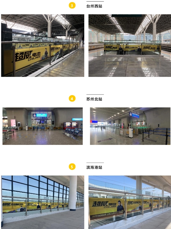 本次超威品牌投放,全面覆蓋 浙江杭州、寧波、臺州、金華、湖州,江蘇蘇州、鹽城、常熟,安徽合肥、池州、阜陽等國內各大城市的重要樞紐站點。無論是候車廳還是站臺,隨處可見亮眼的“超威黃”。