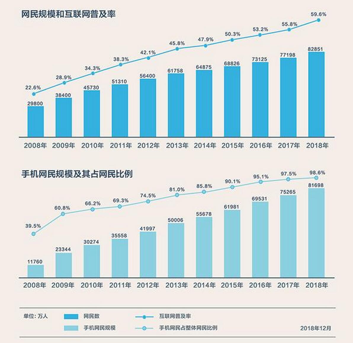 2019年2月28日,中國互聯網絡信息中心(CNNIC)發布第43次《中國互聯網絡發展狀況統計報告》。報告顯示,截至2018年12月,我國網民規模為8.29億,其中手機網民占比達98.6%,互聯網普及率達59.6%。上圖為網民規模和互聯網普及率。下圖為手機網民規模及其占網民比例。